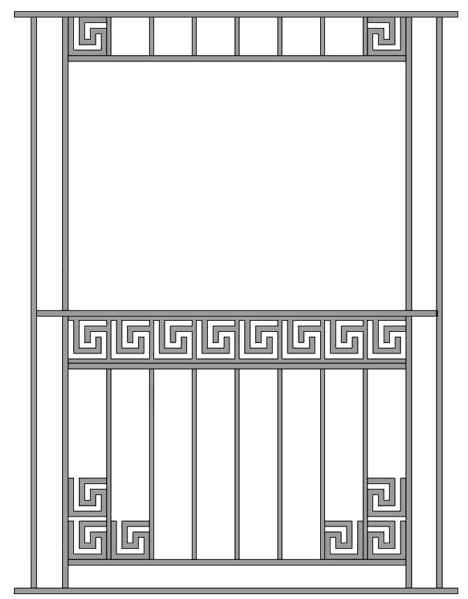 - В комплект беседки, 6 граней, входит пять боковых секций размером ширина 1550 мм высота 50 мм длина 2045 мм и одна входная секция таких же размеров.