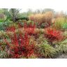 Дерен белый ‘Red Gnome’ (Рэд Гном) – Карликовый сорт, высотой до 1.0 м. Крона плотная полусферическая, побеги ярко-красного цвета. Листья эллиптические, при распускании зеленые с красным налетом. Летом темно-зеленые. Ближе к осени окраска верхней части листа начинает становится бордово-оранжевая. Цветение во второй половине мая, продолжительностью не менее трех недель. Цветки мелкие, белые, собраны в щитковидные соцветия. Плоды белые, шаровидные до 7 мм в диаметре, не съедобные. Для посадки лучше отдавать предпочтение солнечным местам. Нормально растет и в полутени, но менее активно. К почвам не требователен, но не переносит излишней влажности почвы. Хорошо поддается обрезке и формировке. Зимостойкость в условиях Сибири хорошая, в отдельные годы могут подмерзать однолетние побеги. Но в течении сезона крона быстро восстанавливается.