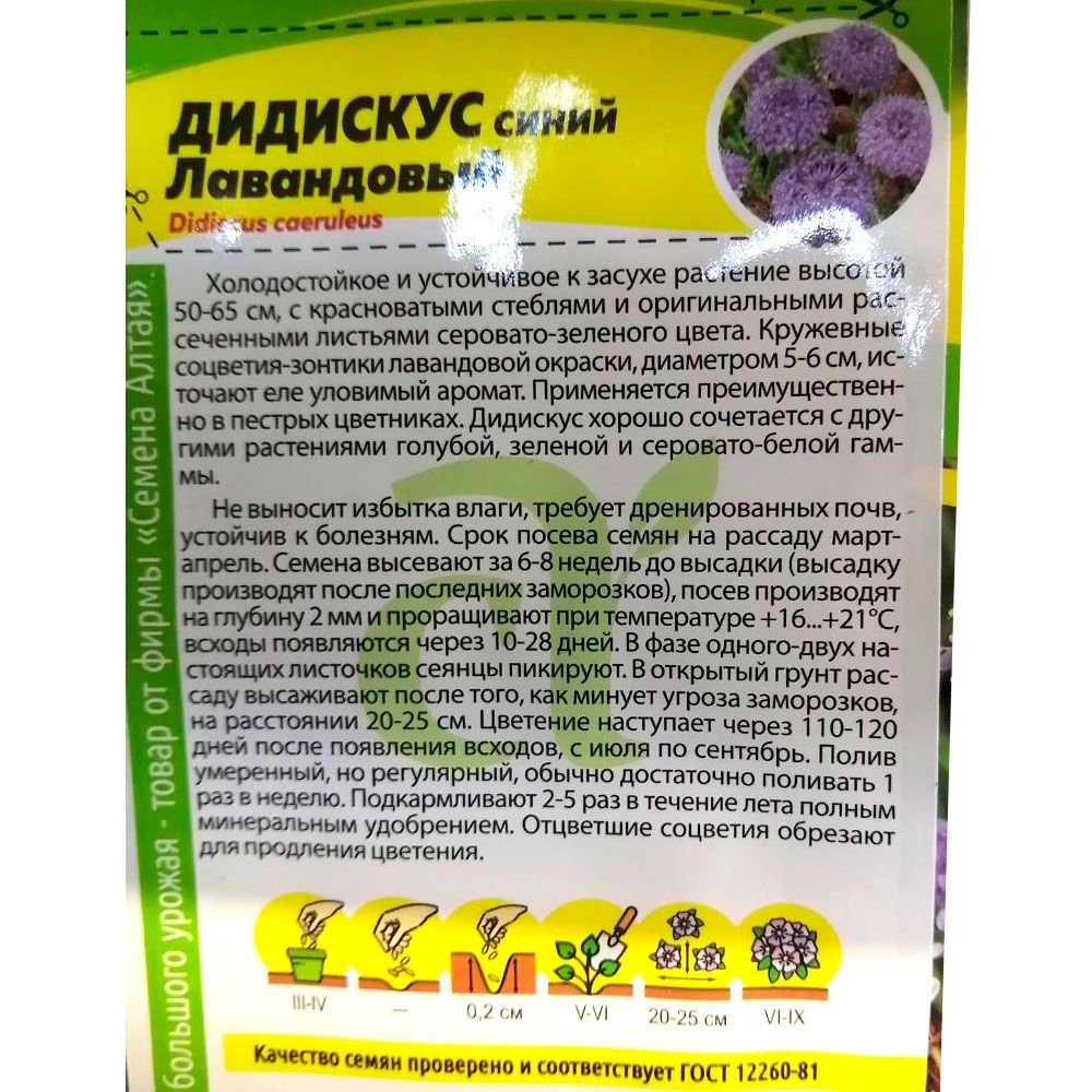 Холодостойкое и устойчивое к засухе растение высотой 50-65 см, с красноватыми стеблями и оригинальными рассеченными листьями серовато-зеленого цвета. Кружевные соцветия-зонтики лавандовой окраски, диаметром 5-6 см, источают еле уловимый аромат. Применяется преимущественно в пестрых цветниках. Дидискус хорошо сочетается с другими растениями голубой, зеленой и серовато-белой гаммы.