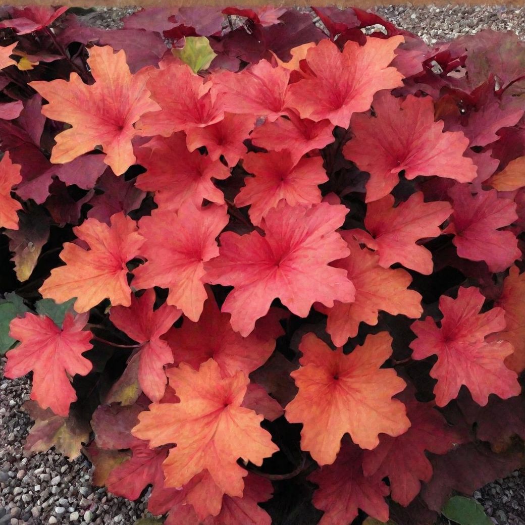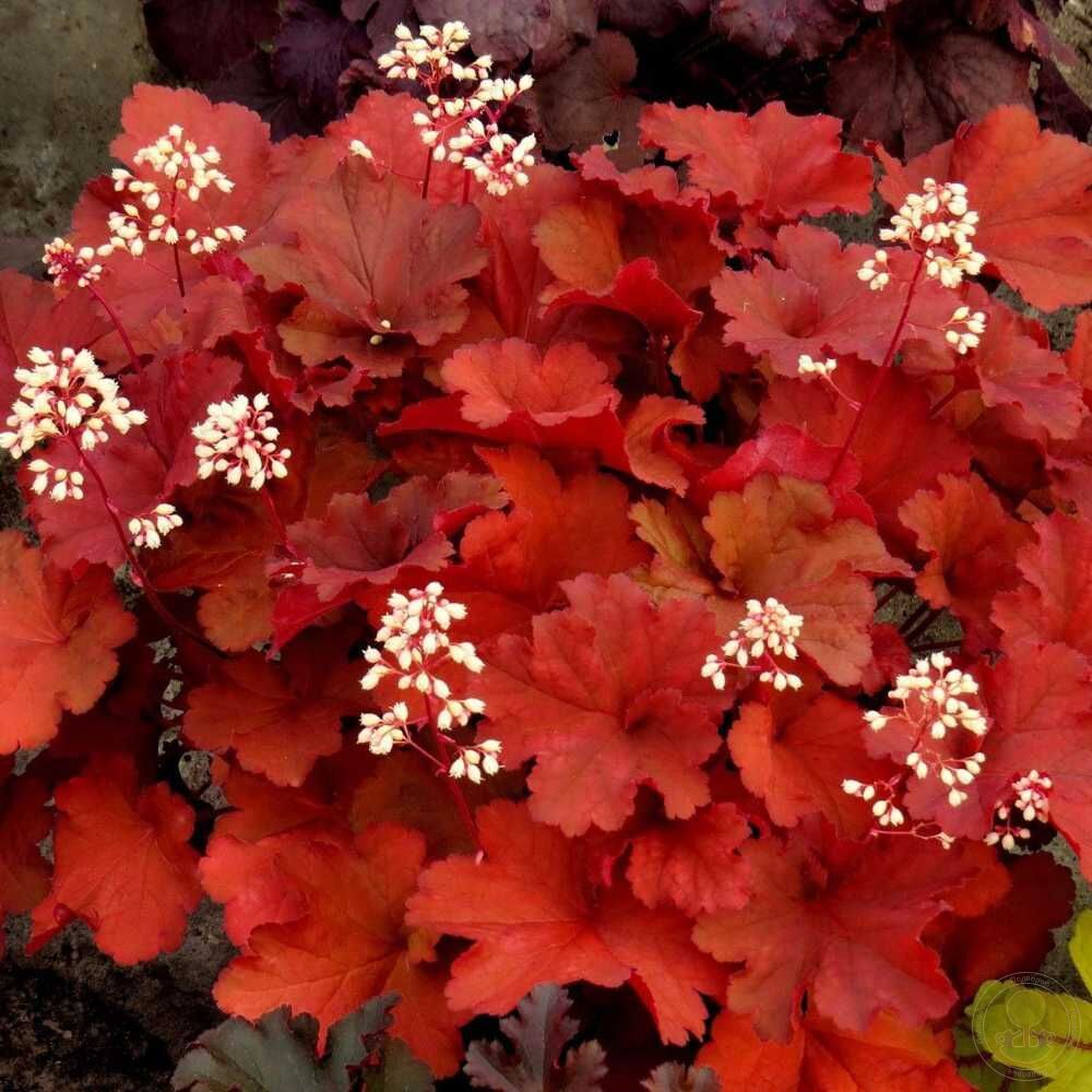 Гейхера ‘Rio’ (Рио) – Вечнозелёный корневищный многолетник, высотой и шириной кроны до 30 см. Листья 5-9-лопастные, собранные в прикорневую розетку, лопасти выражены не сильно. Листья меняют окраску в течении сезона от желто-зеленых, через янтарно-оранжевые цвета до ало-красных. Цветки мелкие, белые, собраны в метельчатые соцветия. Цветение во второй-третьей декадах июня. Для посадки лучше отдавать предпочтение полутенистым местам. Почвы предпочитает свежие, плодородные, нейтральные без застойного увлажнения. Один раз в несколько лет требует мульчирования, так как корневая система поверхностная и корни могут оголяться. Зимостойкость в условиях Сибири хорошая, но желательно укрывать лапником или мульчировать листьями на зиму. Весной срезают отмершие листья.