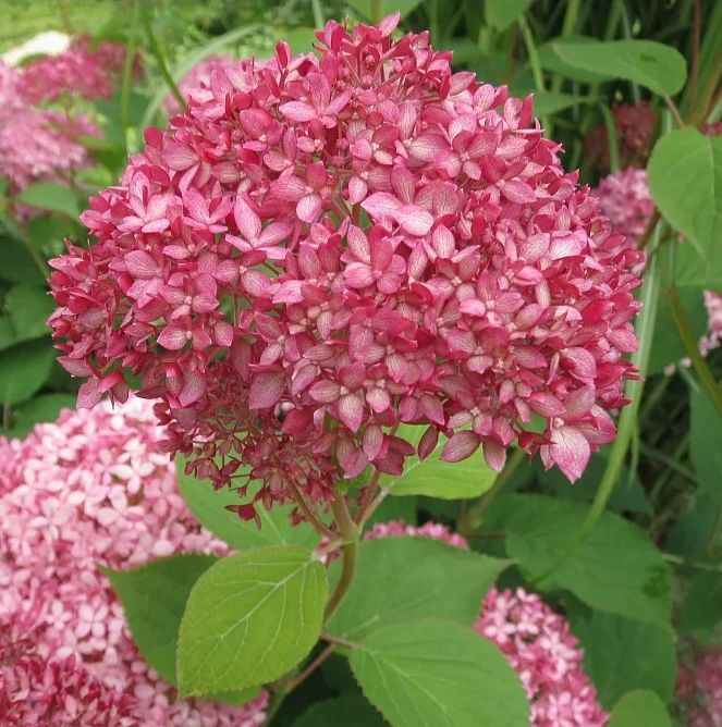 Гортензия древовидная Пинк Аннабель – крупный раскидистый сорт древовидной гортензии. Высота взрослого растения до 1.5 м, ширина кроны до 1.6 м. В период обильного цветения требует подвязки. Соцветия крупные, шаровидные до 20 см, образованы стерильными цветками. Цветки при распускании бледно-розовые, затем становятся насыщенно розового цвета осенью становятся серо-розовых тонов. Цветет с конца июня и до первых заморозков. Предпочитает солнечные места. В тени соцветия мельчают. Почву предпочитает свежую плодородную, кислую или слабокислую. Желательна посадка в защищенных от ветра местах. В сильно холодные зимы может подмерзать, но хорошо восстанавливает крону в течении сезона.