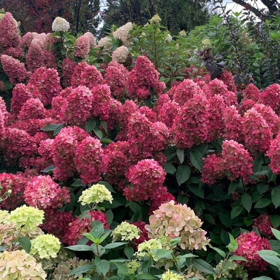 Гортензия метельчатая ‘Bonfire’ (Бонфаер) – высотой до 1.2 м и шириной кроны до 0.9 м сорт с крепкими вертикально направленными побегами. Соцветия плотные, пирамидальные до 45 см в длину, состоящие из стерильных цветков. Цветки крупные, до 6 см в диаметре. Цветки при распускании лаймово-белые, по мере развития становятся светло-зеленые в центре и розовые по периферии лепестка, в конце цветения окраска насыщенного малинового цвета. Цветение с июля до заморозков. Предпочитает солнечные места. В тени соцветия мельчают. Почву предпочитает свежую плодородную, кислую или слабокислую. Желательна посадка в защищенных от ветра местах.