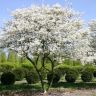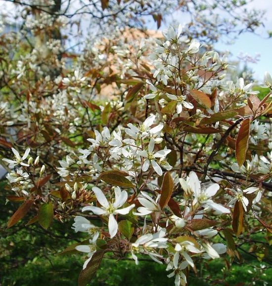 Ирга Ламарка – Многоствольное невысокое дерево до 5.0 м. Крона раскидистая, зонтикообразная за счет косо-вверх направленных скелетных ветвей. Листья эллиптические или яйцевидные, до 10 см длиной, при распускании зелено-медные, затем становятся зеленые сверху и сизые с нижней стороны листа, осень окрашиваются в оранжевые и красные тона. Цветение в первой декаде июня, почти одновременно с распусканием листьев. Цветки некрупные, звездчатой формы, белые, собраны в кистевидные соцветия. Цветение не продолжительное, 7-10 дней. Во второй половине июля созревают темно-пурпурные округлые сладкие плоды. Для посадки лучше отдавать предпочтение солнечным местам. Переносит и полутень, но цветет хуже. К почвам не требовательна, но не переносит излишней влажности почвы. Хорошо переносит городские условия. Зимостойкость в условиях Сибири хорошая.
