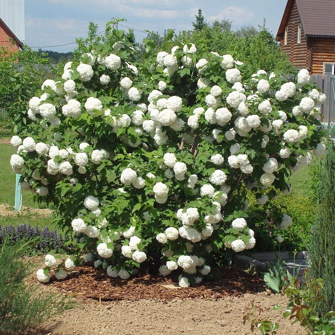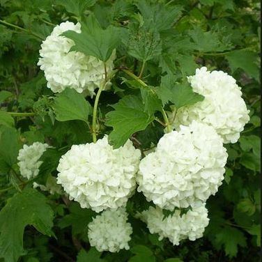 Калина обыкновенная ‘Roseum=Boule de Neige’ (Розеум=Бульданеж) – Кустарник до 2.5 м высотой. Крона раскидистая, густая до 2.0 м шириной. Листья 3-5 лопастные, зеленые. Осенью окрашиваются в желтые тона. Цветение во второй декаде июня. Цветки крупные стерильные, собраны в шаровидные соцветия. При распускании цветки зеленовато-белые, затем становятся белоснежно-белыми. Цветение средней продолжительности, 12-17 дней. Плодов не образует. Для посадки лучше отдавать предпочтение солнечным местам. Переносит и полутень, но цветет хуже. Почвы предпочитает плодородные и свежие без застоя влаги. Посадка желательна в защищенных от ветра местах. Хорошо переносит городские условия. Часто поражается тлей и калиновым листоедом, поэтому требует профилактических обработок от насекомых. Зимостойкость в условиях Сибири хорошая, но иногда обмерзают концы однолетних побегов.