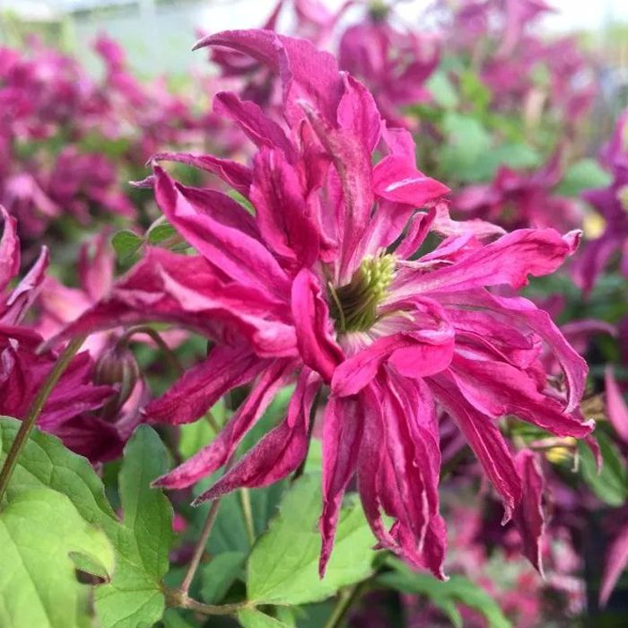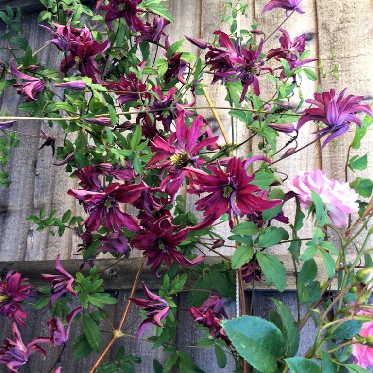 Клематис Розалин – новый сорт, полученный в Голландии благодаря использованию клематиса фиолетового Витицелла (Viticella). Как и все сорта клематисов группы Витицелла, данный сорт необыкновенно здоровый и неприхотливый. Цветы диаметром 4 сантиметра. Буйное цветение с июня до сентября. Высота 2 метра. Третья группа обрезки (сохраняем 15 сантиметров). Нетерпим к солнечным, знойным местам. Клематис Розалин способен сформировать превосходное цветущее живое ограждение на незанятых участках садового участка, перголах и арках, обвивать беседки и формировать изумительную входную группу. Цветет на протяжении всего лета. Богатое буйное цветение представлено неизменно бархатными цветочками необыкновенной конфигурации пурпурно-красной расцветки с белыми полосками на внешних чашелистиках. Количество чашелистиков 4. Они вырастают до 3 сантиметров по длине и до одного сантиметра по ширине.