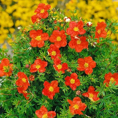 Лапчатка кустарниковая ‘Marion Red Robin’ (Марион Ред Робин) – Компактный сорт с плотной подушковидной кроной до 50 см высотой и до 100 см шириной кроны. Цветки ало-красные 2-3 см в диаметре, почти не выгорают Солнце. Цветение продолжительное, с конца июня и до сентября. Для посадки следует выбирать только солнечные места с хорошо дренированной почвой. Хорошая засухоустойчивость. Зимостойкость в условиях Сибири высокая.