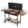 Функциональный гриль-мангал из толстой стали со складными полками и крышкой барбекю. Крышка оборудована термометром и заслонкой для регулировки притока воздуха, а в основании топки устроен выдвижной зольник.
