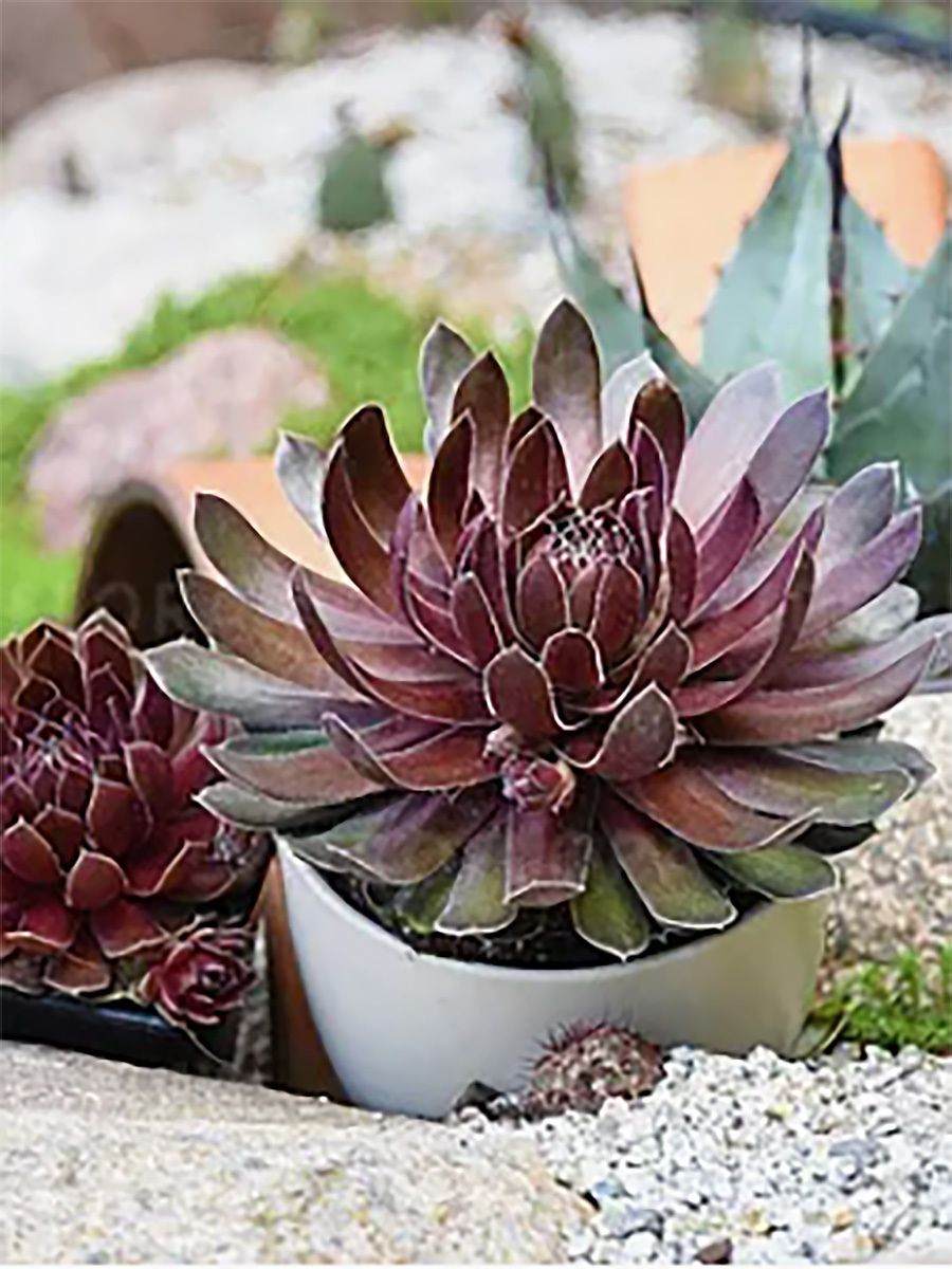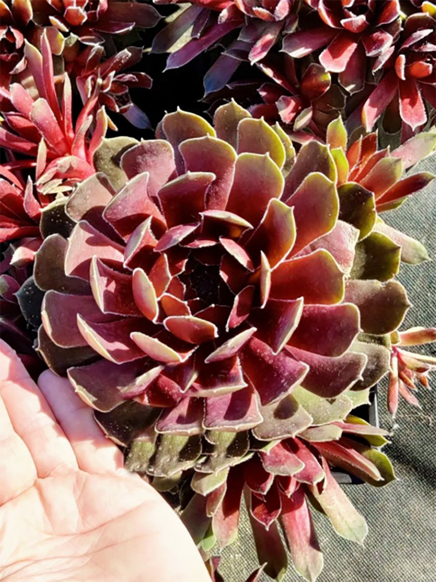 Молодило ‘BigSam Ruby Star’ (БигСэм Руби Стар) – Розеточный почвопокровный многолетник до 5 см высотой. Диаметр розетки до 12 см. Листья мясистые, весной красно-бордовые, затем становятся темно-зелеными с темной окантовкой по краям. Цветение в июне-июле. Цветонос до 10 см длиной. Предпочитает солнечные места, с сухой, хорошо дренированной почвой. Не переносит застоя влаги и перелива. После отцветания розетка постепенно отмирает, однако быстро восстанавливается за счет образования дочерних розеток на столонах. Зимостойкость высокая, в дополнительном укрытии не нуждается.