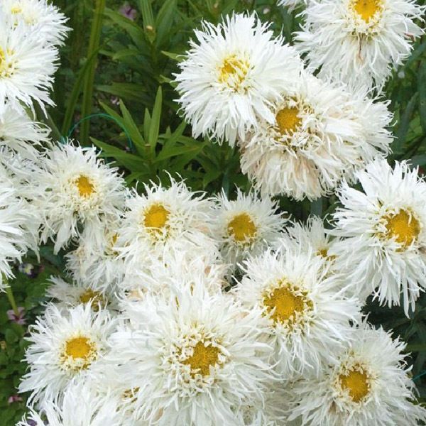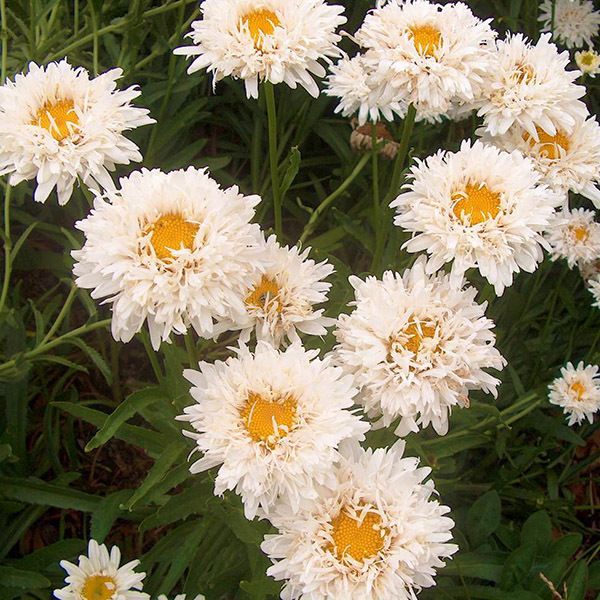 Нивяник великолепный ‘Crazy Daisy’ (Крэйзи Дэйзи) – Корневищное многолетнее растение высотой до 70 см. Листья ланцетные, темно-зеленые, по краю крупнозубчатые. Соцветия крупные махровые, до 10 см в диаметре. Лепестки белые. Цветение продолжительное с июня по август. Для посадки предпочитает солнечные места, но может расти и в полутени. К почве не сильно требователен, но лучше избегать тяжелых почв с избыточным увлажнением. Зимостойкость высокая, в дополнительном укрытии не нуждается.