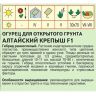 Раннеспелый гибрид. Растение индетерминантное среднеплетистое, преимущественно женского типа цветения, образует до трех завязей в одном узле. Плоды зеленые со светлыми полосами до 1/3 длины, среднебугорчатые, белошипые, длиной 10-11 см, массой 70-90 г, генетически не горькие.