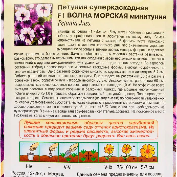 Гибриды из серии F1 «Волна» (Easy wave) получили признание и любовь у профессионалов и любителей по всему миру. Самая неприхотливая из петуний с каскадной формой куста, прекрасно растет даже в условиях короткого дня, что значительно упрощает выращивание рассады в зимние месяцы (январь, февраль) и сдвигает сроки цветения на более ранние. Даже в неблагоприятных условиях растения развиваются равномерно, это делает их незаменимыми для создания смесей нескольких оттенков, цветочных композиций с другими декоративными культурами уже на стадии ранних всходов. Во взрослом состоянии гибриды превосходят все известные каскадные формы, включая «сурфинию» по многим параметрам. Одно растение формирует множество, крупных цветков диаметром 5-7 см.