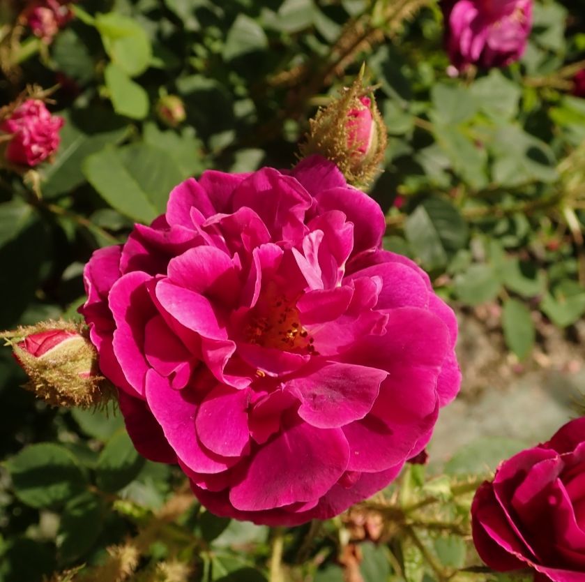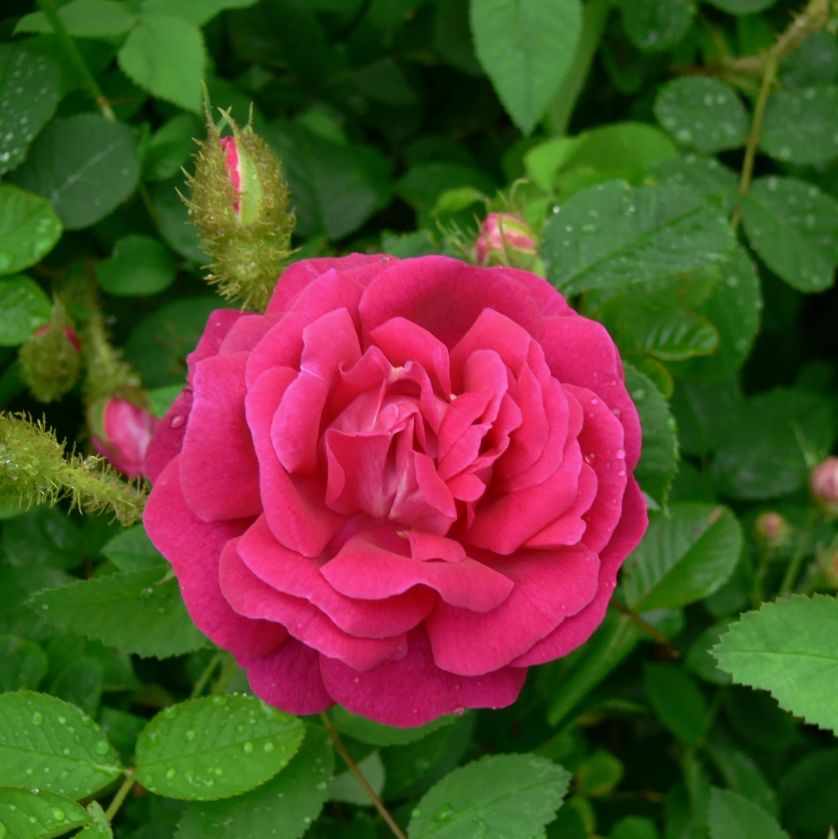 Роза ругоза ‘Henri Martin’ (Анри Мартин) – Парковый сорт с вертикальной раскидистой кроной до 1.8 м высотой. Побеги сильно шиповатые. Цветки полумахровые темно-розовые или малиновые, ароматные до 7 см в диаметре, собраны в соцветия, состоящие из 3-5 цветков. Зацветает во второй декаде июня. Цветение продолжительное, до сентября. Хорошо растет солнечных местах, в полутени хуже. Почвы желательны плодородные, хорошо дренированные, свежие. Высокая устойчивость к болезням. Зимостойкость высокая, но обмерзает выше уровня снегового покрова.