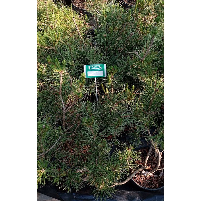 Pinus mugo var. mughus (Мугус) – подвид горной сосны с распростертой кроной, до 3 м высотой. Побеги немного коленчатой формы, приподнятые вверх, поэтому часть побегов нижних мутовок, расположенных ближе к центру растения, могут «ложиться» на почву. Диаметр кроны до 3м. Хвоя темно-зеленая круглый год, жесткая, до 5см длиной. Годовой прирост до 20 см. Предпочитает солнечные места, хорошо переносит сухие почвы. Зимостойкость высокая, но иногда может «обгорать» часть хвой. На физиологическое состояние сказывается минимально, но снижает декоративность, пока не распустятся новые побеги.