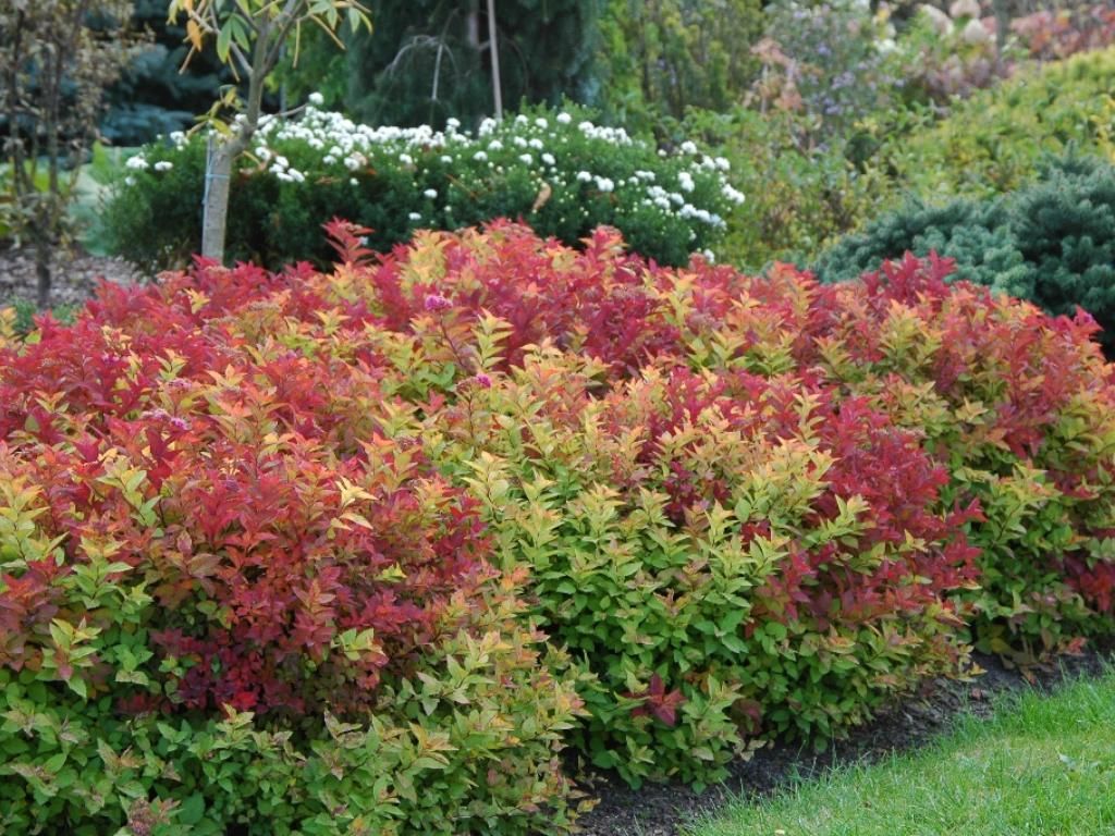 Спирея японская «Макрофилла» – красивое растение с яркой листвой, меняющей оттенок в зависимости от времени года. Имеет крупные, воздушные листья, которые обладают длиной 20 см и шириной 10 см. Куст может вырасти больше метра в высоту и полтора метра в ширину, в год прибавляя до 25 см. Очень неприхотливый, относится к группе летнецветущих кустарников. Цветение начинается на третий год жизни растения с середины лета и длится до начала осени. Цветки светло-розового цвета собраны в маленькие метелки. На фоне ярких листьев их нежный вид быстро теряется. В июне окрас листьев может быть ярко-красным или фиолетовым, в июле – зеленым, а ближе к осени они имеют наиболее интересный желто-золотистый оттенок. Как уже говорилось, быстро растет, не боится морозов.