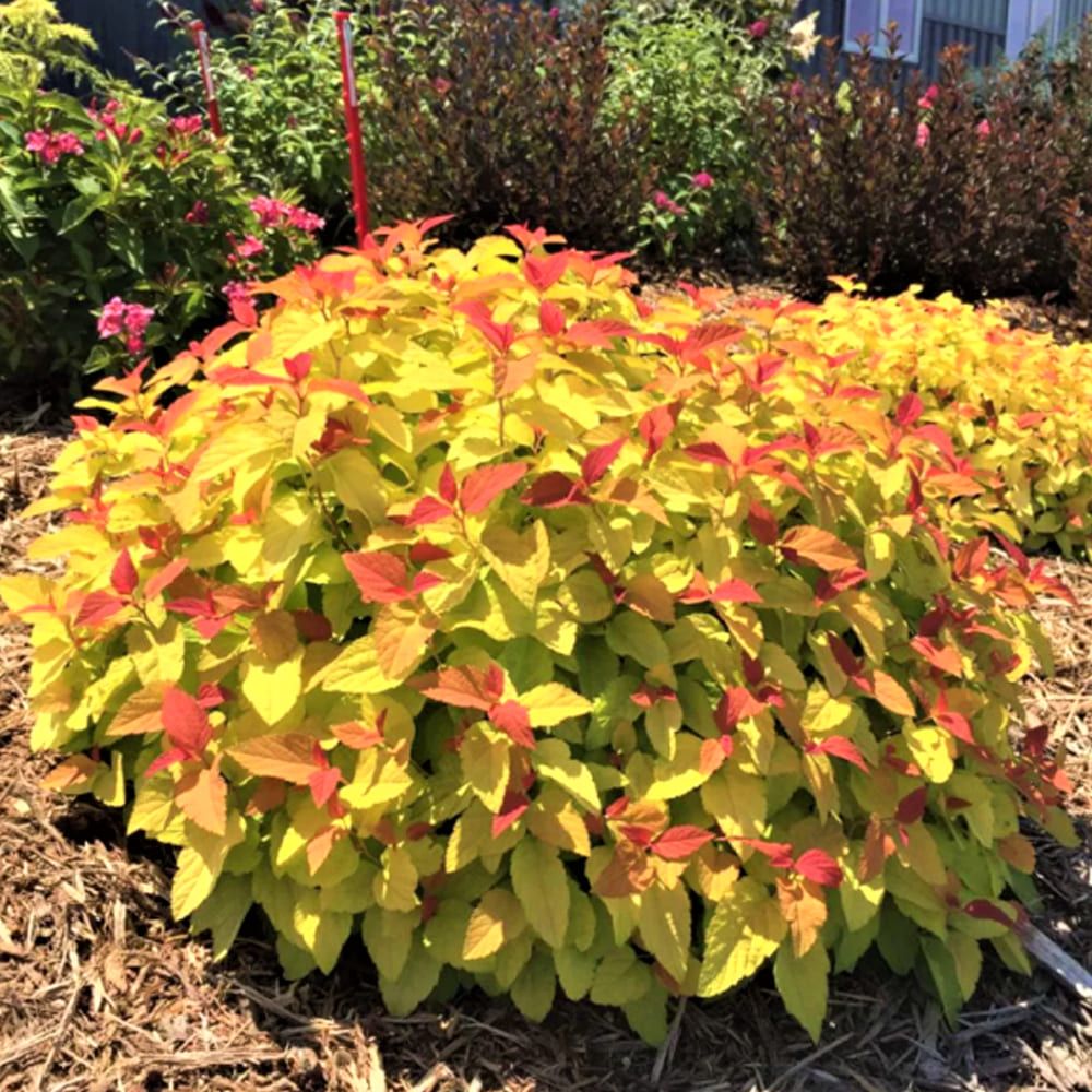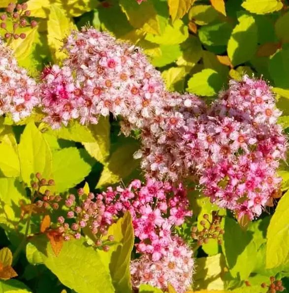 Спирея японская ‘Merlo Star’ (Мерло Стар) – Компактный сорт с округлой кроной. Высота взрослого растения не превышает 0.5 м, ширина кроны до 0.6 м. Листья ланцетные, края зубчатые. При распускании листья красно-винные в течении пары недель, затем становятся неоновой желто-зеленой окраски. Осенью окрашиваются в оранжево-красные тона. Цветки розовые некрупные, собраны в щитковидные соцветия. Цветет обычно в конце июня, не менее трех недель. Для посадки лучше всего выбирать хорошо освещенные места, в полутени растет хуже. К почвам не требовательна: может расти на любых, но без застойного переувлажнения. В отдельные годы возможно подмерзание побегов.
