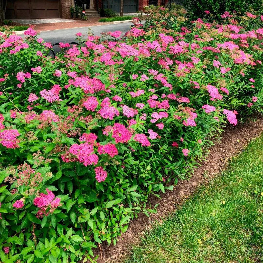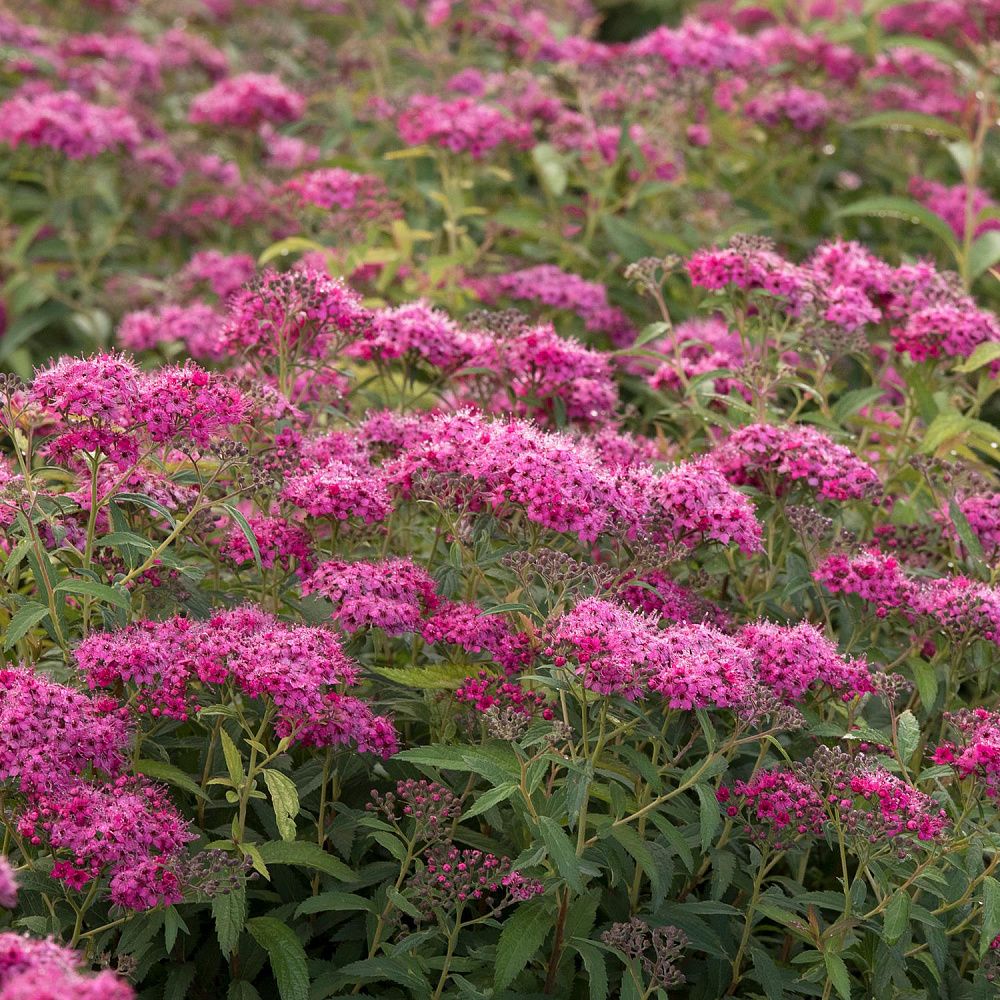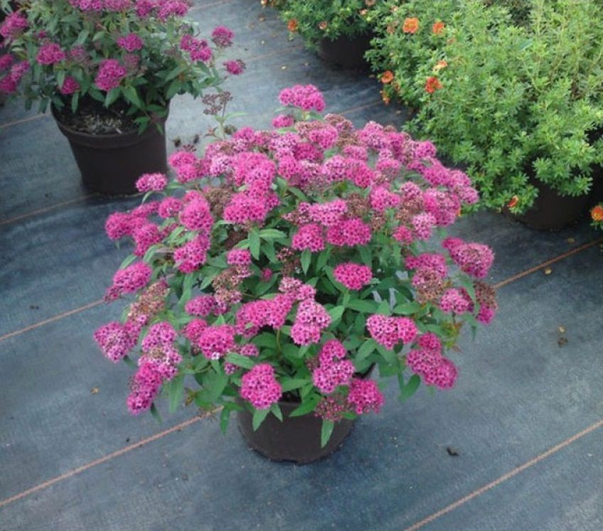 Спирея японская ‘Neon Flash’ (Мерло Стар) –Cорт с округлой раскидистой кроной. Высота взрослого растения до 0.9 м. Листья узкие ланцетные, края зубчатые. При распускании листья бордовые в течении пары недель, затем становятся темно-зеленые. Осенью окрашиваются в красно-бордовые тона. Цветки лилово-розовые некрупные, собраны в щитковидные соцветия. Может цвести два раза за сезон. Первый раз цветет обычно в конце июня, не менее трех недель. Второй раз зацветает в конце августа. Для посадки лучше всего выбирать хорошо освещенные места, в полутени растет хуже. К почвам не требовательна: может расти на любых, но без застойного переувлажнения. В отдельные годы возможно подмерзание побегов.