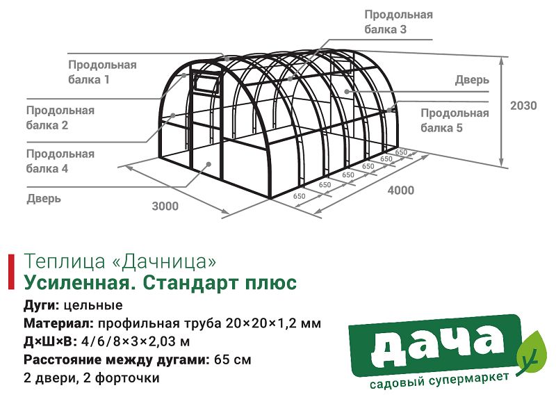 - Каркас теплицы: арки состоят из двойных цельных дуг, выполненных из профильной трубы 20*20*1,2мм, что делает теплицу одной из самых прочных на рынке.