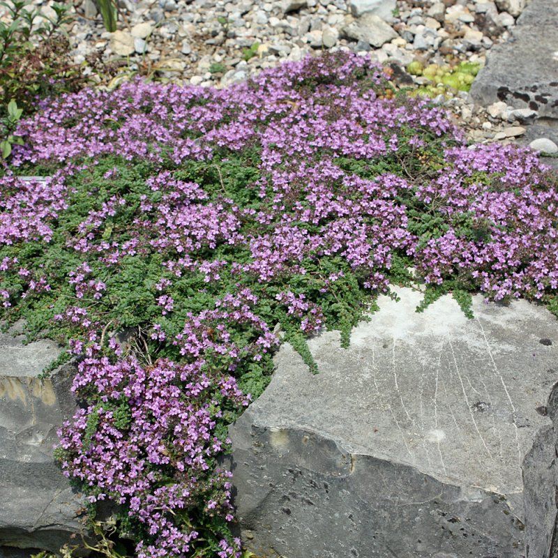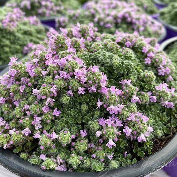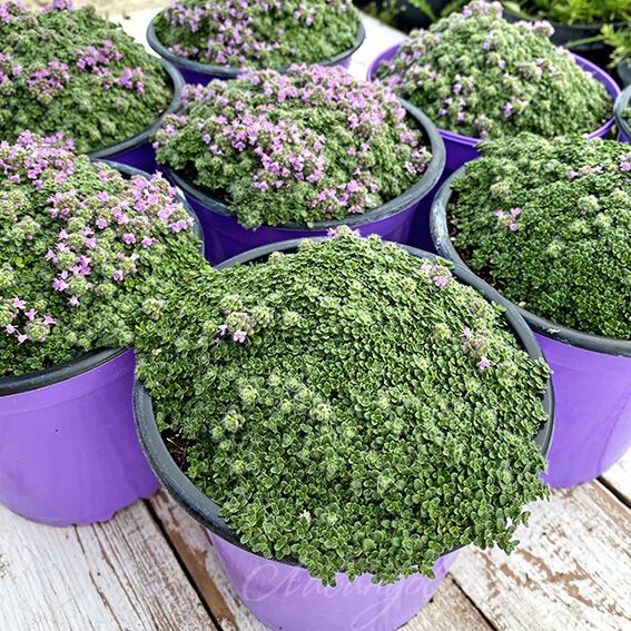 Тимьян (чабрец) Пигмей (Pigmeus) – это декоративный многолетник, который широко используется в ландшафтном дизайне благодаря своему нежному внешнему виду и душистым розовым цветам. С его помощью оформляют склоны, альпийские горки, рокарии, бордюры, палисадники, скальные участки. Это растение хорошо смотрится в групповых посадках. Тимьян Пигмей создает плотный ковер и поэтому идеально подходит для заполнения пустых пространств. Этот сорт можно выращивать и в контейнерах, размещая их на террасах или балконах. Пигмей является низкорослым и достигает высоты около 5 сантиметров. Его стебли очень тонкие и стелющиеся, образуют плотный ковер. Листья растения очень маленькие и плотно посажены на стеблях. Они имеют темно-зеленый или сизо-голубой цвет. Кроме того, листья обладают сильным классическим ароматом чабреца. Соцветия этого сорта шишковидные, окрашены в сиренево-розовые тона.